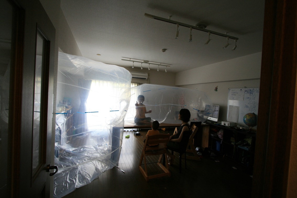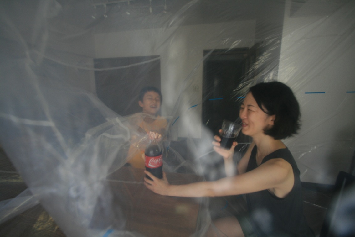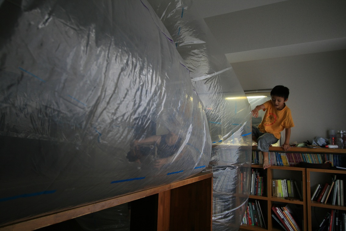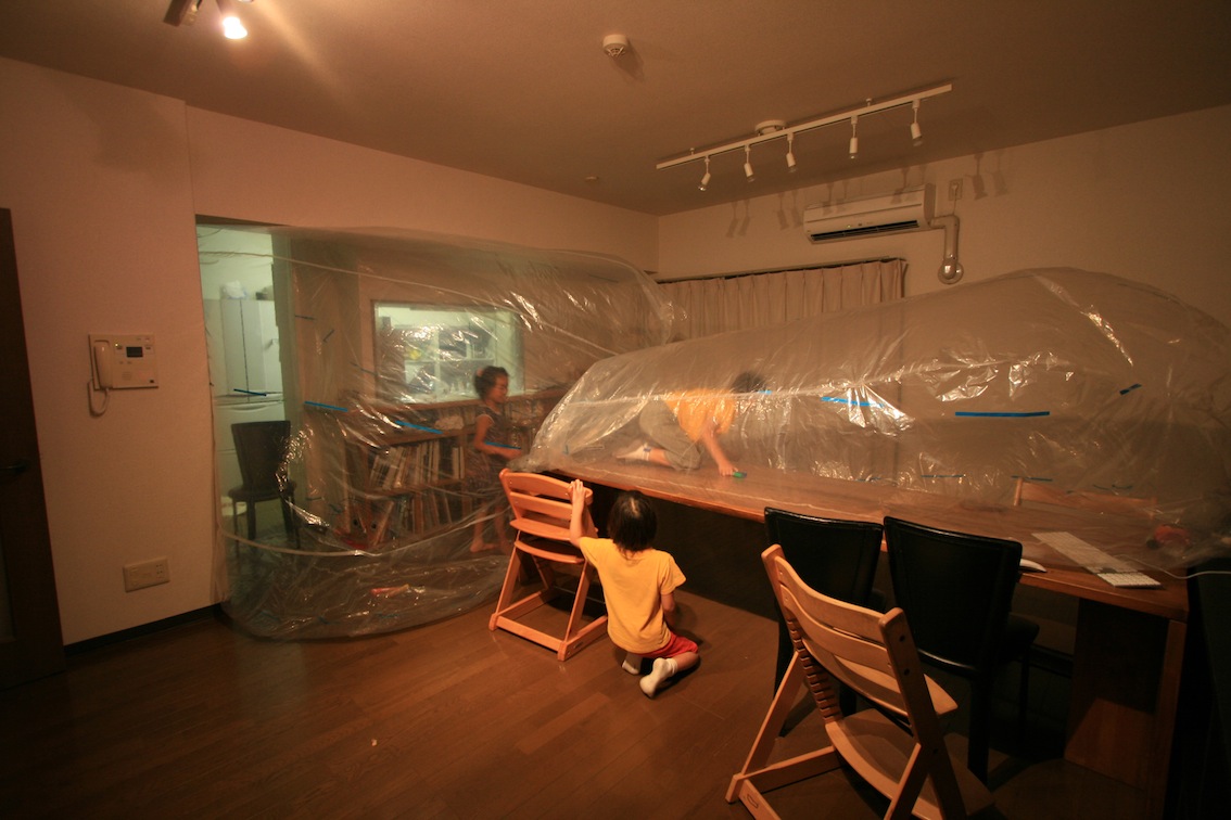 そしてその「境い目」を題材に遊んでみようということで、松井さんの「君の天井は僕の床」の作品の原理をつかって参加者各自が自宅に新たに物理的な境界を制作・設営します。