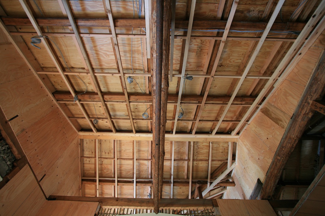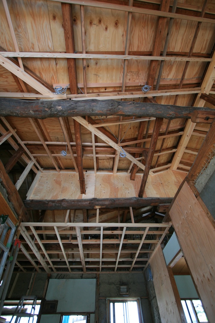 天井の下地が組まれ、部屋のボリュームが認識できるようになりました。小屋組を見せた天井が高すぎず低すぎず、いい感じです。