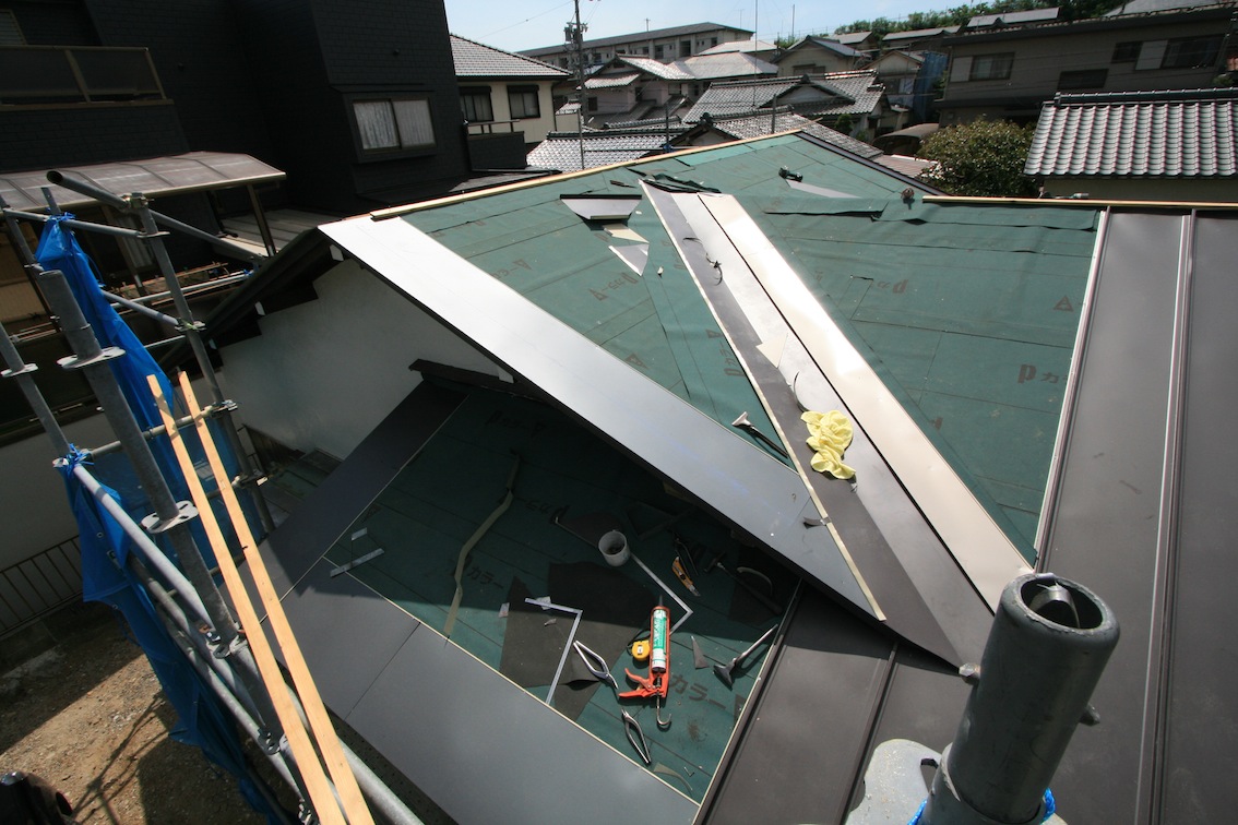 屋根は4寸勾配、とはいうものの築50年!谷木の位置出しに苦労された、と大工さん。デザイン的に重要な箇所だったので、うまく納めていただきほっとしました。