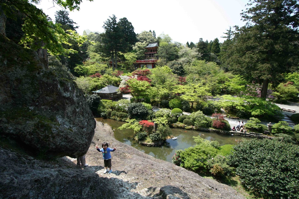 大きな岩壁や高低差などの地形を魅力的に活かした境内です。