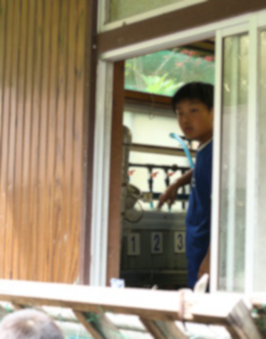 テーブル番号がかかれた箱を前にお兄ちゃんが奮闘しています。