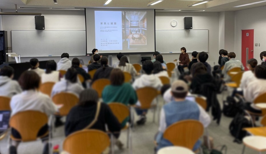 テーマは「家具と建築」、家具作家スニッカの小林夫妻と塩田で対談形式の授業です。