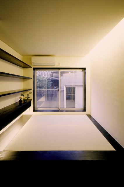 外観はRC打放の集合住宅です。内部はワンルームですが、天井を高くとって水回り上部をロフトにつかうなど、空気は一体でもエリアが仕切られた空間構成。