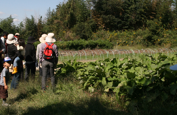 畑をまわって作物の生育状況や種類等を見学させていただきながら、生産者の方々のお話を伺います。