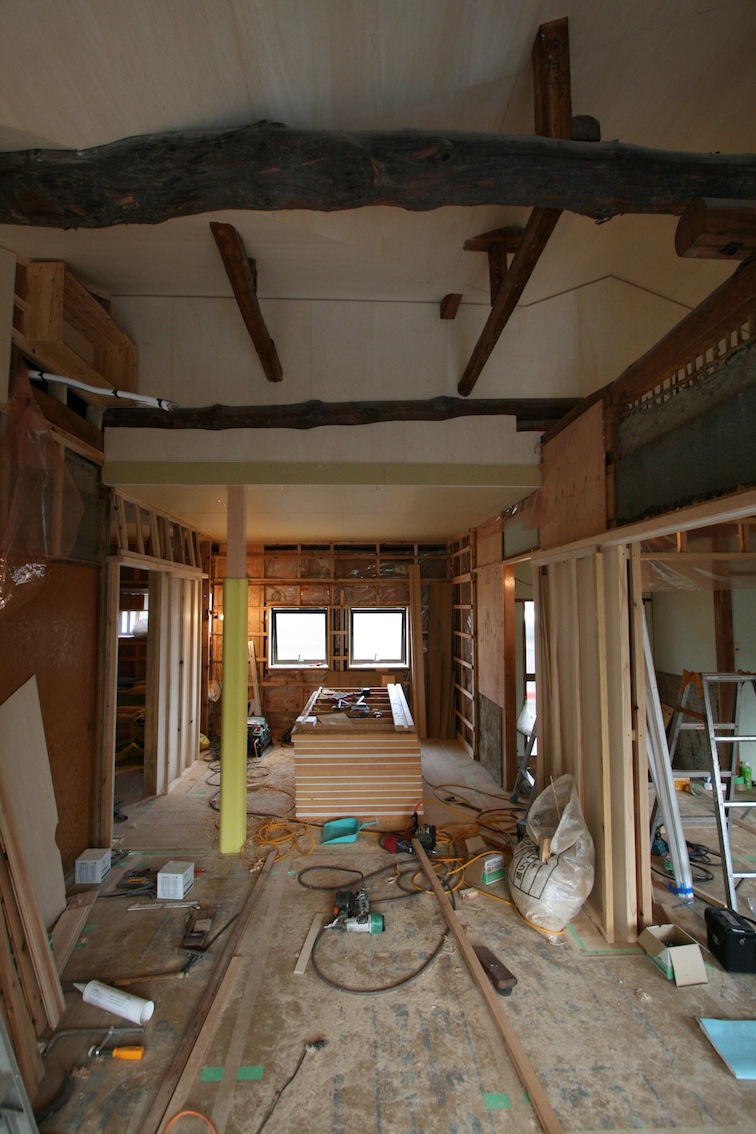 10月はじめの現場です。「古い家の補修工事」の趣から一転、「新しい家の施工現場」の印象に変わっていました。壁下地の施工が進んできたからでしょうね。