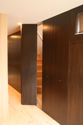 階段への扉が壁面クローゼットと同じ折戸でつくられています。